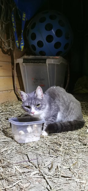 Grå med svake striper på kroppen. Hvite poter foran og hvite bein bak. Hvit på nesa, hals og bryst. Usikker på under. Vet ikke kjønn. Veldig kjælen.