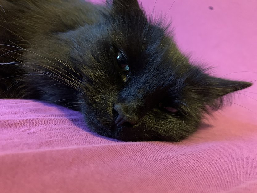 Stor hunnkatt med svart litt rødlig lang pels. Hun er 1/4 maine coon.