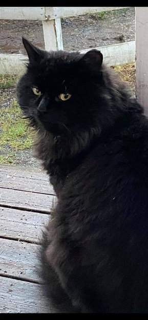 Langhåret ensfarget sort hannkatt. Ukastrert og ikke chippet, full av floker så måtte helbarberes. Tam og tillitsfull pus.