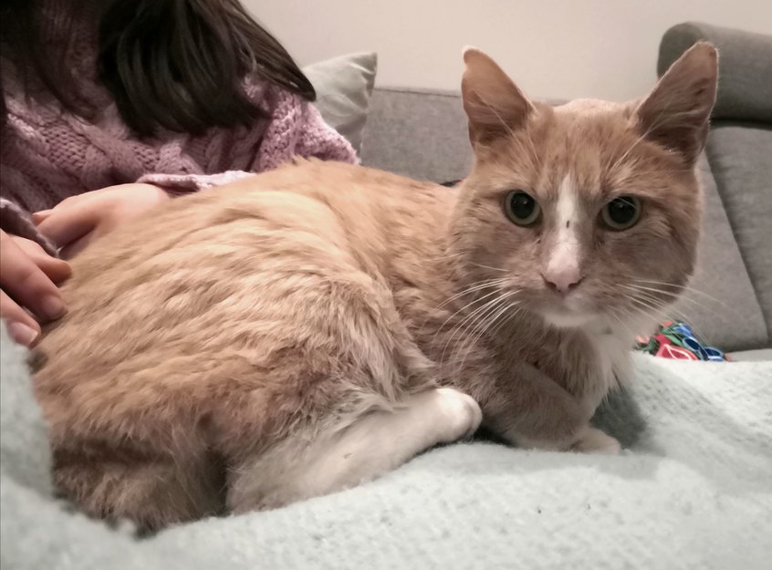 Funnet i en garasje i Blåveisvegen 11. Tynn og skitten. Halen er amputert(mistet) etter nekrose eller klippet av.
