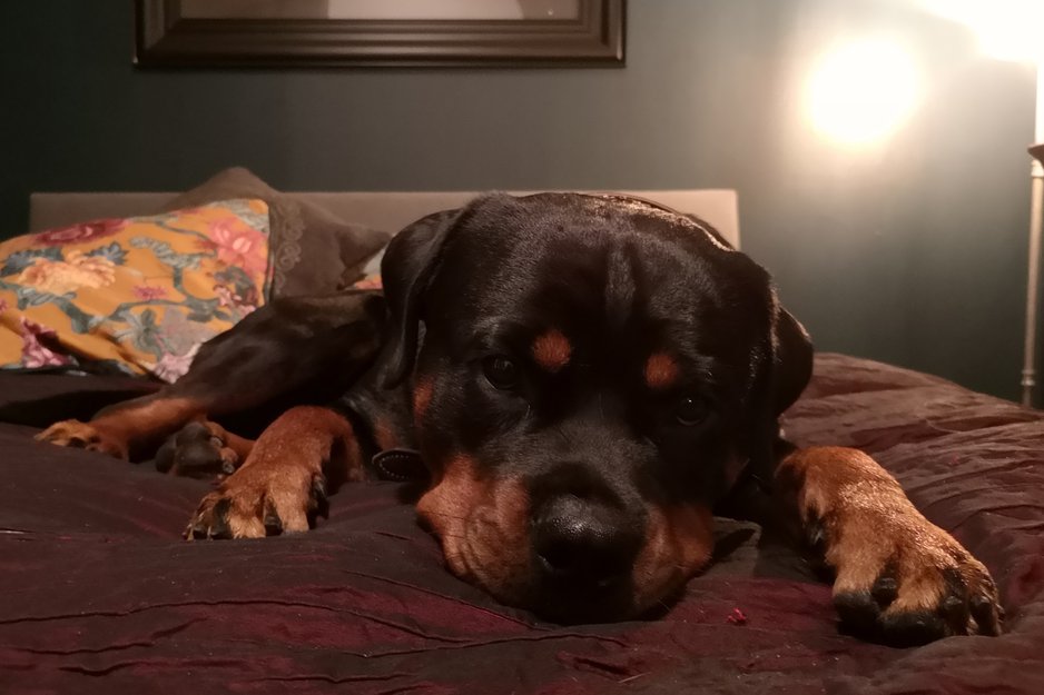 Han har svart tynt hålsbånd i tøy på seg. Ca 50 kg