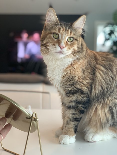 Hvit og skilpaddefarget med meget lang og buskete hale. Luna er lang og stor, veier ca 6 kg. Ikke redd hunder. Lange svarte dusker på ørene. Brun flekk i det hvite på ene hælen bak. Fire hvite poter, strømper på bakbena. Hvite kinn, hvitt bryst.