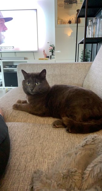 Pus har mørkegrå, veldig myk pels. Hun er litt lysere grå på potene. Hun har gule, store øyne. Hun er litt sky for fremmede mennesker, men veldig snill og kosete når hun stoler på noen.
