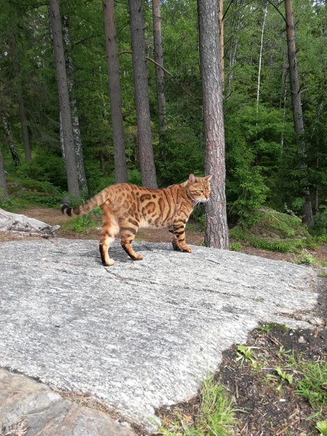 Har fint spotted mønster i pelsen, ser ut som leopardmønster. Kan være litt forsiktig men kontaktsøkende. Lyder på navnet sitt. Har tatovering i øret for chip.