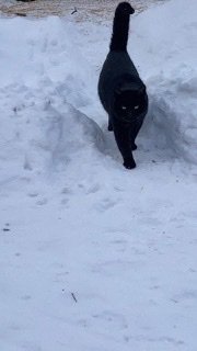 En svart korthåret hannkatt uten chip har vært i området ganske lenge men siste tiden slått seg til her på gården. Det liker de andre kattene dårlig. Den mjauer og er veldig kosete.
