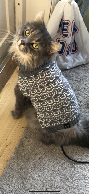 Barbert ned grunnet floker, skulle ikke ut men klart å komme seg ut. Har på en grå genser grunnet barberingen