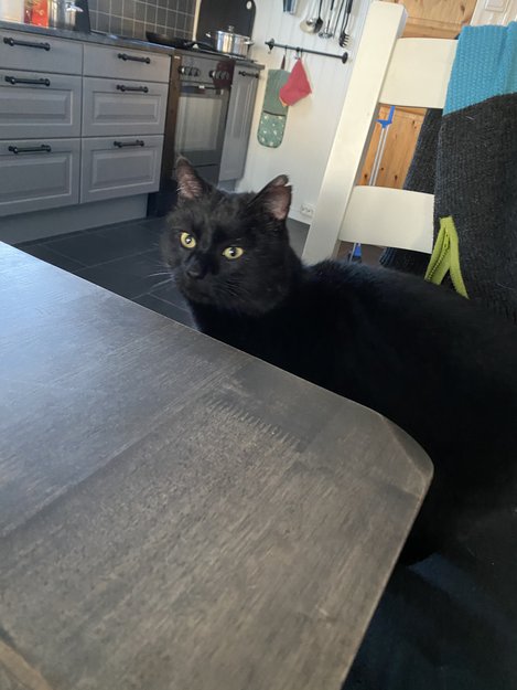 Sort ukastrert hannkatt med noen hvite hår på brystet har gitt seg til på gården. Kjempekosete og kjælen. Har et hakk i venstre øre. Rund og fin i kinnene. Har klart å snike seg inn ved et par anledninger. Dukket opp rundt juletider/litt før