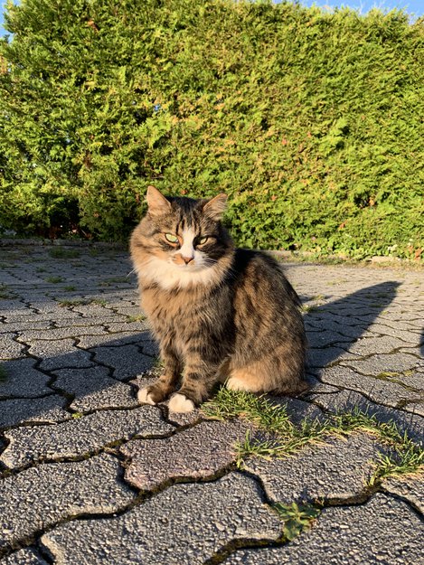 Er hvit over nesen, mellom øynene og rundt munnen, men har en brun flekk på nesen, som går ut over værhårene på ene siden. Kan også se ut som om han har mistet en bit av den ene ørespissen.