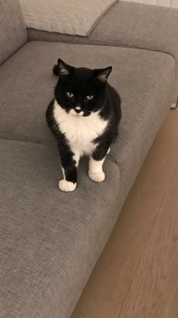 Katten er sort og hvit den ser og hör litt dårlig og den prater litt.