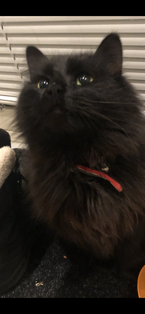 Svarte poter. Svart nese. Lutt brunt i pelsen. Mulig en hun- katt? Rolig og fin pus. Oppsøkende. Halsbånd. Den mjauer ikke.