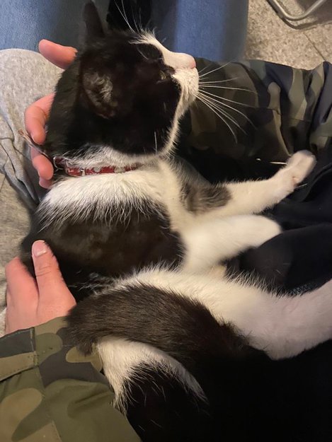 Vi bor på Grorud og fant en svart og hvit katt. Hun har en rød halsebånd