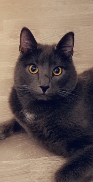 Helt grå. Litt hvit på halsen. Snart to år gammel. Stor katt med tykk pels. Svært sky mot ukjente mennesker.