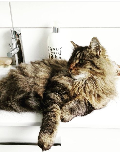 Delvis skogskatt, lang pels. Har en liten kul på beinet under magen. Kosete.