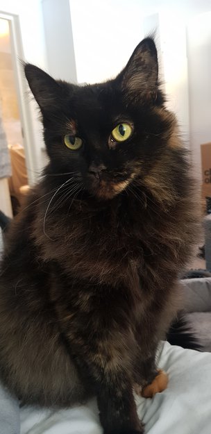 Døren stod åpen på kveldstid for å lufte litt, og så gikk hun ut på terrassen uten at jeg merket det. Jeg lukket døren bak henne etter en times tid siden jeg trodde hun var inne, og først etter et par timer igjen åpnet jeg døren for å slippe henne inn. Har ikke sett eller hørt noe siden. Dette er hennes første tur utendørs, og hun er veldig redd mennesker og andre katter.