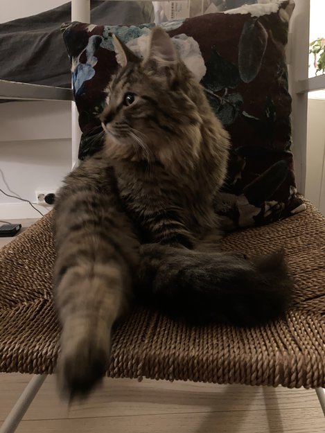 Han har stor buskete hale og en liten hvit flekk i alt det mørke på brystet. Kjælen og nysgjerrig.