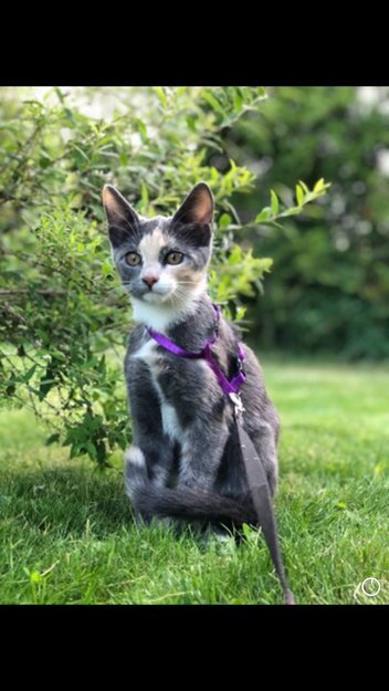Hun er ett år gammel, litt liten, kort hår, og veldig skvetten og ganske nærvøs. Hun er tricolor, mørkegrå, litt spraglet pels på rygg, litt hvit under på magen opp til brystet, rosa nese med brune trekk i ansiktet. Brune/grønne øyne. Hun har hvite poter med litt brunt og er hvit under halsen og på brystet.