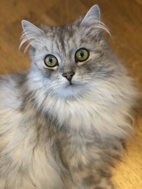 Kompis er blanding av perser og norsk skogkatt. Han har grå lang pels og veier 4,5 kg.