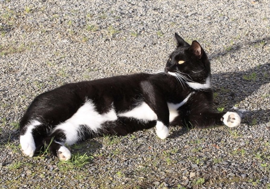 Svart og hvit huskatt, hvit i barten, under halsen, under magen og på poter. Hakk i ørene.Gule øyne. Stor, ca 5-6 kg.