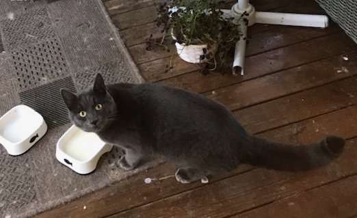 Grå katt kommer på besøk innimellom. Ønsker å vite om den har et hjem. Har ikke kommet nær nok til å få sjekke chip. Usikker på kjønn, mulig hannkatt. Vet ikke om den er kastrert.