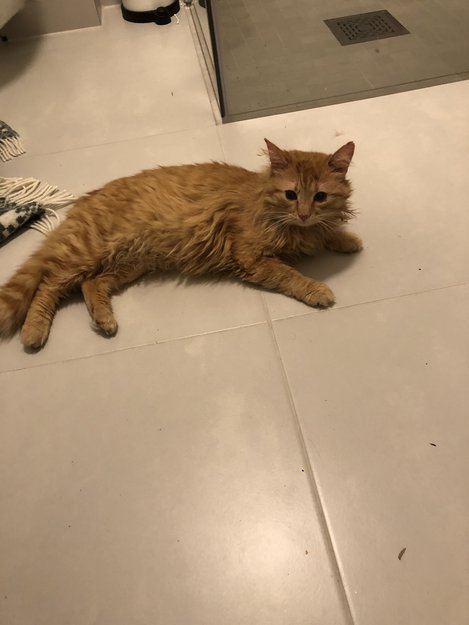 Den er mager, og har litt rufsete/folkete pels. En del sår rundt ørene, ser ut som det er noe galt med en klo også.