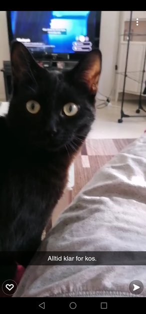 Svart med brun underpels, arr på ene øret etter katteslagsmål. Kjempekosete og pratete.
