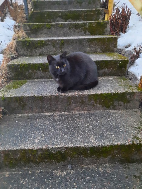 Svart, korthåret m litt hvitt på brystet, veldig kosete og mjauer masse, men ingen eier den her. Har vært her i ca 3 uker