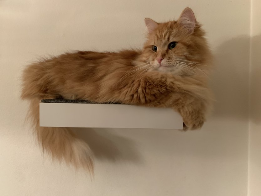 Gul, oransj branner katt med lang pels. Har veldig lang pels og pustete hale. Litt skjeve øyne. Katten er Id merket og Jar halsbånd med navn og tlf nr.