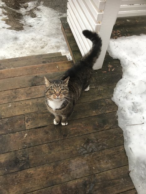 Denne katten har vært i nabolaget i ca 2 år, både dag og natt. Sovet i busker og oppholdt seg i skur. Var veldig sky. I oktober 2020 turte den å komme bort og hilse på. Jeg ga den ikke mat på dette tidspunktet. Den er her i lengre perioder og jeg ser den omtrent daglig. De siste dagene har den spist av fuglematen/tørt brød og etter det har jeg nå gitt mat. Veldig sulten. Ser velfødd ut så jeg håper den har et hjem. Finner ingen chip. Har satt på et halsbånd med spm om noen eier og mitt mobilnummer.