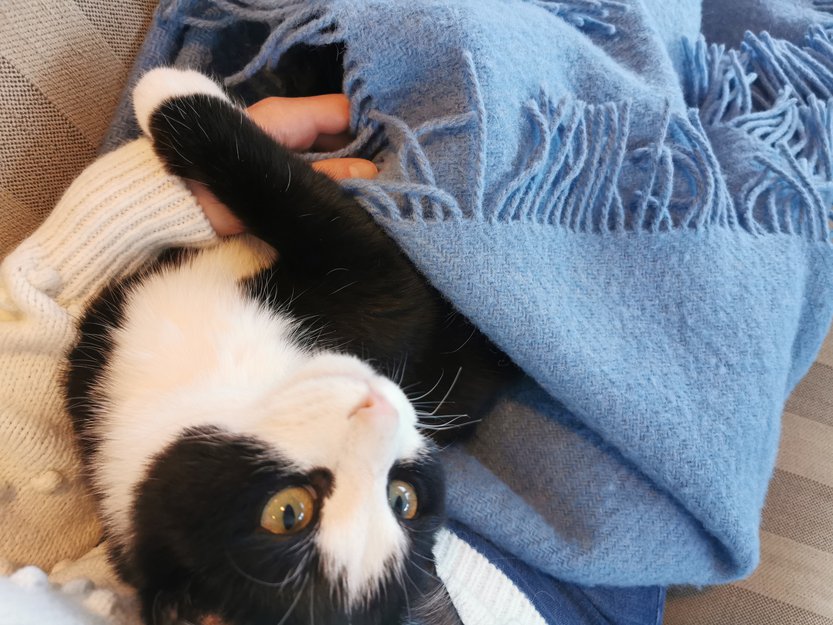 Han er en liten katt, veldig sosial og leken. Snart 1 å gammel. Hvite poter. Han har tatovering i øret og er id merket.