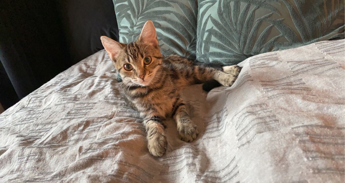 Hun er en liten katt med veldig lang hale. Pelsmønsteret kan minne litt om en bengal. Hun har aldri vært ute før så hun kan kanskje virke litt redd og utforskende.