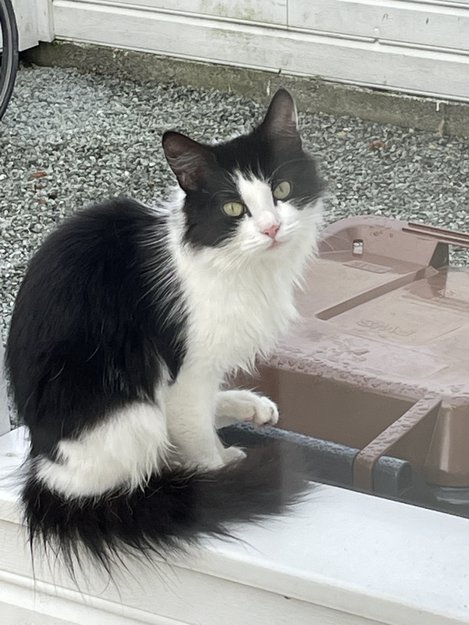 Sitter foran døren min og vil komme seg inn. Mjauer. Er sulten.