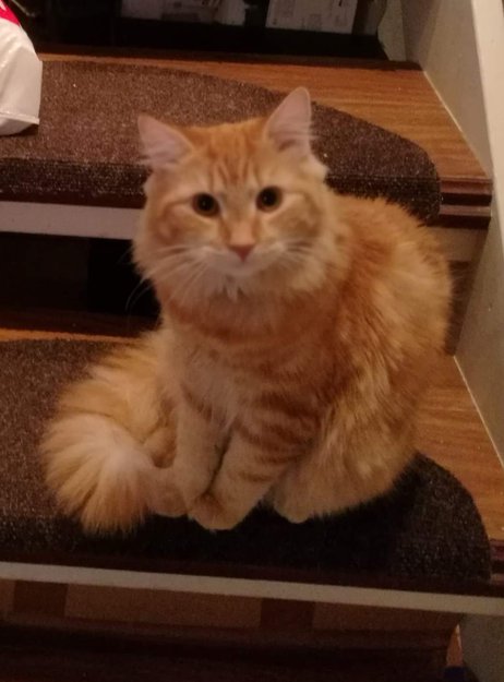 Han har aldri vært ute på egenhånd kun i bånd med oss. Han blir 1år i Mai og nylig kastrert og chippet. Han er oransje, hvit og beige tigrer med gule øyne. Han har en skade på leppa og har nylig fått behandling hos veterinæren så han mangler noen værhår.