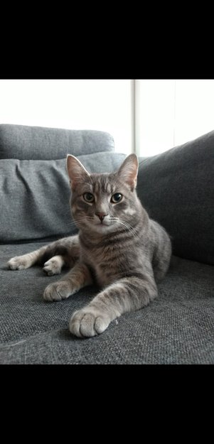 Kastrert hannkatt, litt over middels stor, 2 år, gråstripete. Skeptisk til ukjente folk. Chippa.