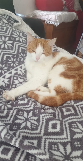 Rød og hvit. Korthåret. Nesten samme farge på øynene som fargen i pelsen.