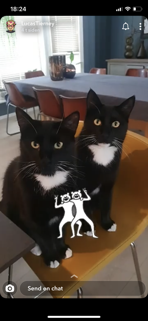 Veldig kosete og kontaktsøkende. Maler og markerer med å stryke borti mye. Går elegant med hvite bein og sort blank pels.