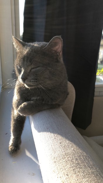 Grå med en lite hvit flekk under haka. Lyder navnet Mario, er veldig kosete og går ofte rundt og mjauer.