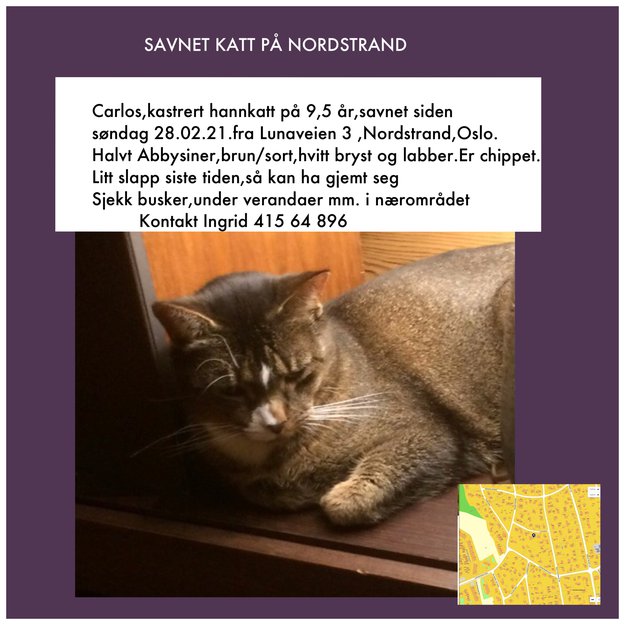 Carlos,hannkatt på 9,5 år savnet siden 28.02.21.fra Lunaveien 3 på Nordstrand i Oslo. Er chippet. Carlos har vært slapp siste tiden,kan ha lagt seg til i nabolaget.