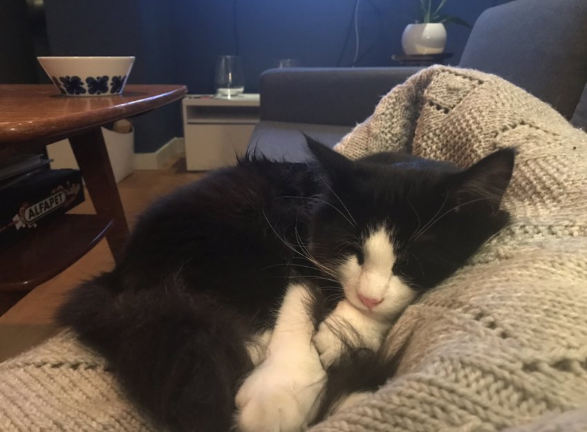 Han är 7 månader, men ser större ut. Är svart och vit. Har stor, yvig svans. Ett svart bakben. Väldigt kosete, maler høyt.