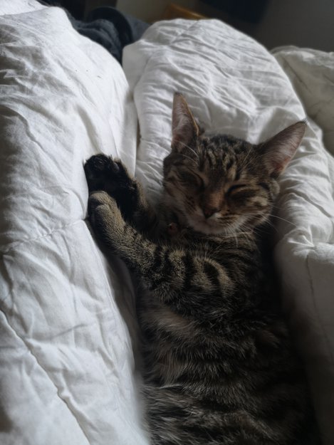 Hun har en rosa halsbånd med en liten bjell. Grå striper.