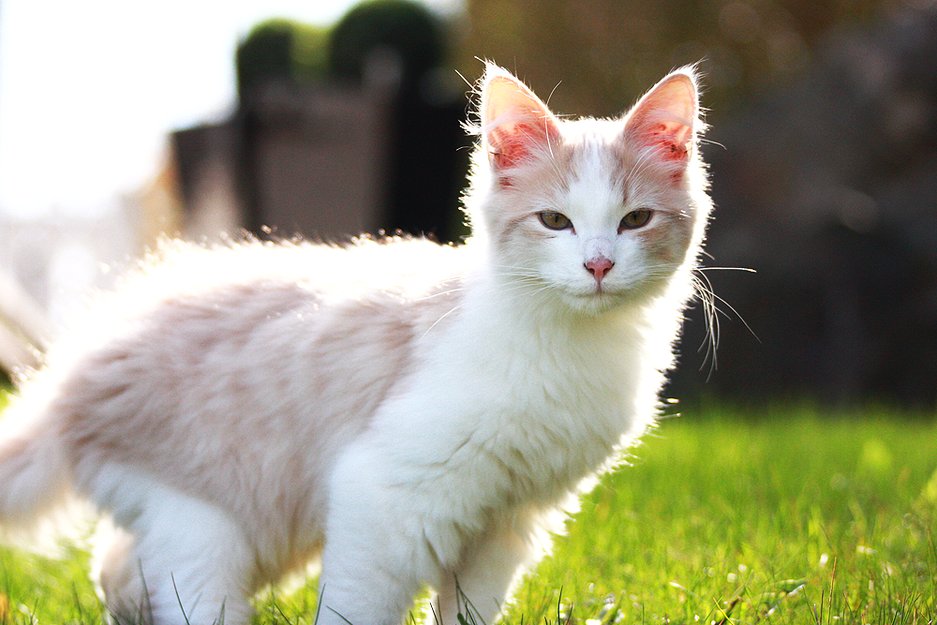 Kattungen er hvit med lys oransje/beige flekker. Noe lang pels.