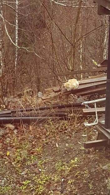 Rød og hvit hannkatt, ganske sky. Noe mager og ustelt (bærer preg av å ha gått ute en stund).