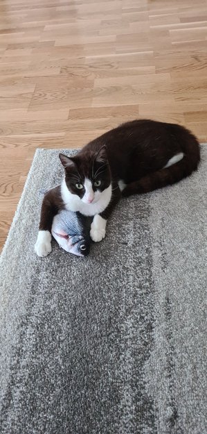 Han er svart med litt brunskjær i utenom i ansiktet, føttene og under der er han hvit. Veldig kosen, ikke redd å går opp til alle han møter.