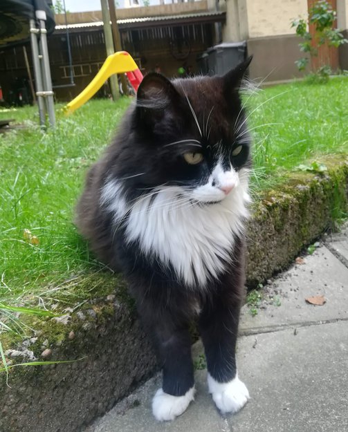 Forsvunnet fra bakgård. Har aldri vært utenfor bakgården før. Lite sannsynlig at han har blitt med noen frivillig, da han er sky. Pleier aldri være ute mer enn 30 min om gangen. Vil nok gjemme seg godt hvis han er redd.