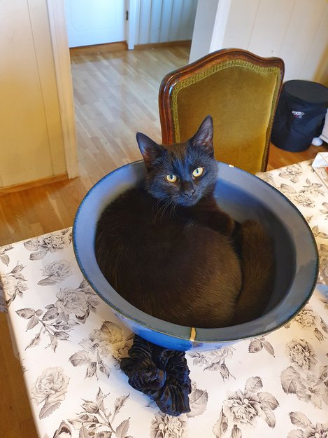 Nemi er sort og 10 mnd gammel, Id-merket, hun er også en skipskatt så Nemi har ekstra med poter.