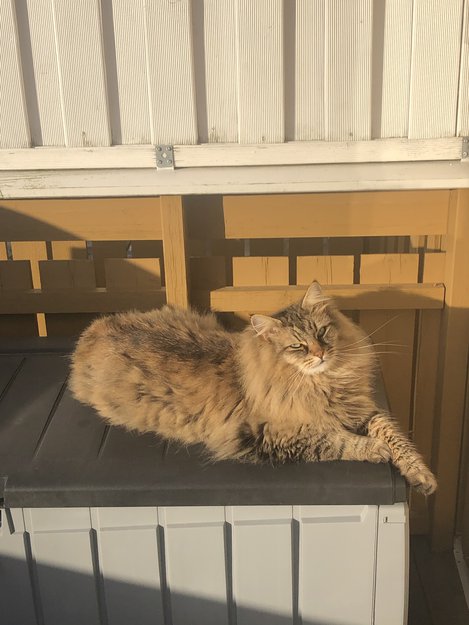 Han er stor, ca 5,5 kg. Tillitsfull og sitter ofte midt i veien. Er derfor redd han kan være påkjørt.