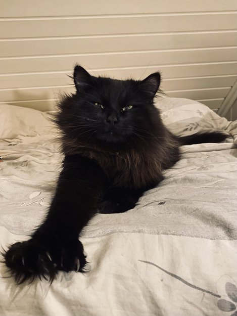 Helt sort skipskatt, veldig kosete og vennlig, hilser gjerne på hunder.