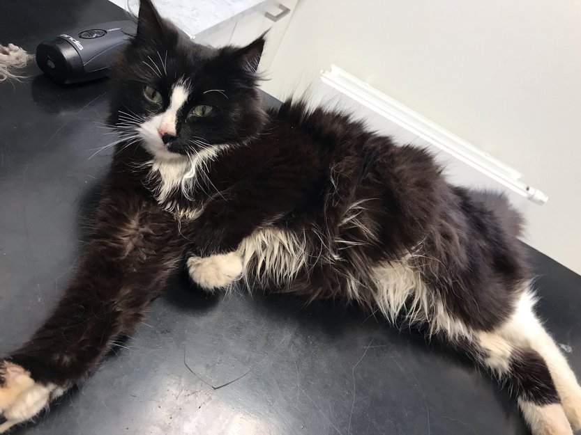 Sort og hvit jente, mistenker ukastert, på ca 7mnd funnet ute. Er vandt med mennesker og meget kosete. Ikke redd for hunden i hjemmet heller. Elsker barna. Ikke id-merket. Tynn, men ikke anoreksi, møkkete, men ikke masse tygger i pelsen. Frisk og sulten.