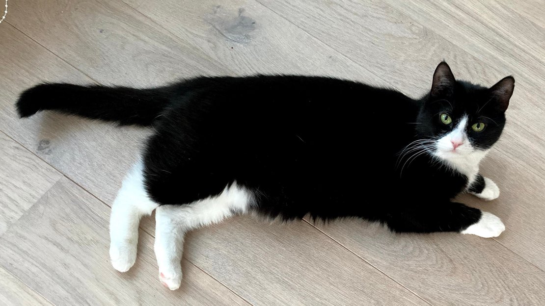 sort og hvit hunkatt. Det venstre øret har en liten flis. Redd for mennesker, spesielt barna.
