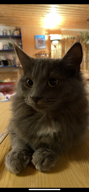 Langhåret, hvit flekk fremme på brystet. Hadde oransje halsbånd med bjelle og navnetube når hun gikk ut. Er chippet.