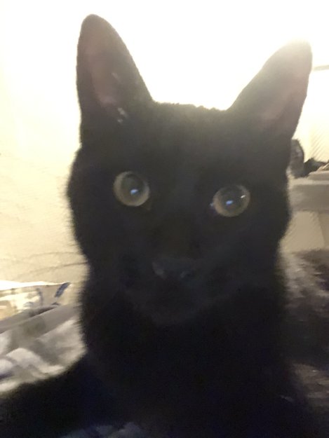 Hel sort med noen svært få hvite strå under haka/ halsen. Er blanding av Mail Coon/ skogskatt og skipskatt. Ikke spesielt stor. Ett år gammel. Kosete og «pratsom». Ikke chippet eller id-merka.